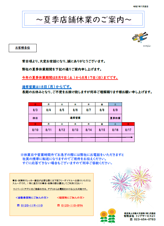 では、下記のとおり、弊社の夏季休業期間をご案内致します。宜しくお願いします。